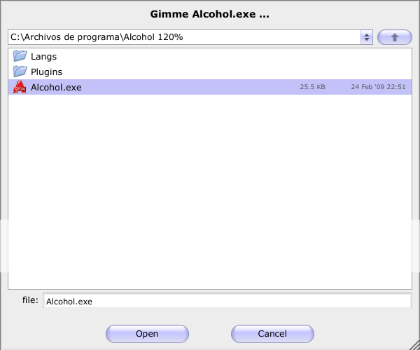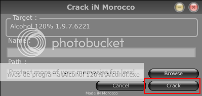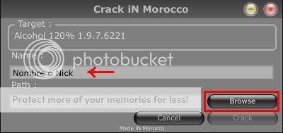 Ejecuten el Crack y escriban su nombre o alias en la casilla "name" despues busquen (click en Browse) el archivo ejecutable de Alcohol 120% (la “A” que dice 120%) que se encuentra en la carpeta donde se instaló.